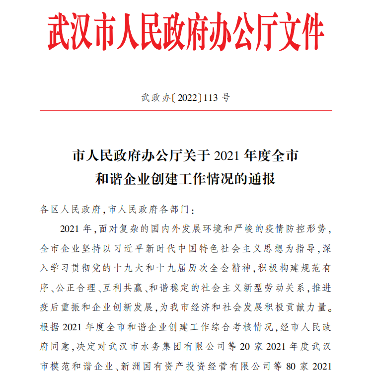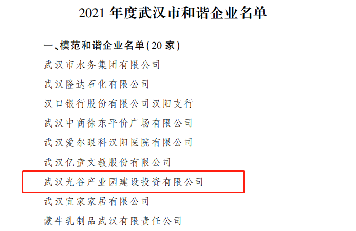近日,武漢市人民政府辦公廳發(fā)布了《2021年度全市和諧企業(yè)創(chuàng)建工作情況的通報》,武漢光谷產(chǎn)業(yè)園建設投資有限公司繼榮獲武漢市和諧企業(yè)、職工心靈加油站稱號后,獲評“2021年度武漢市模范和諧企業(yè)”榮譽稱號。