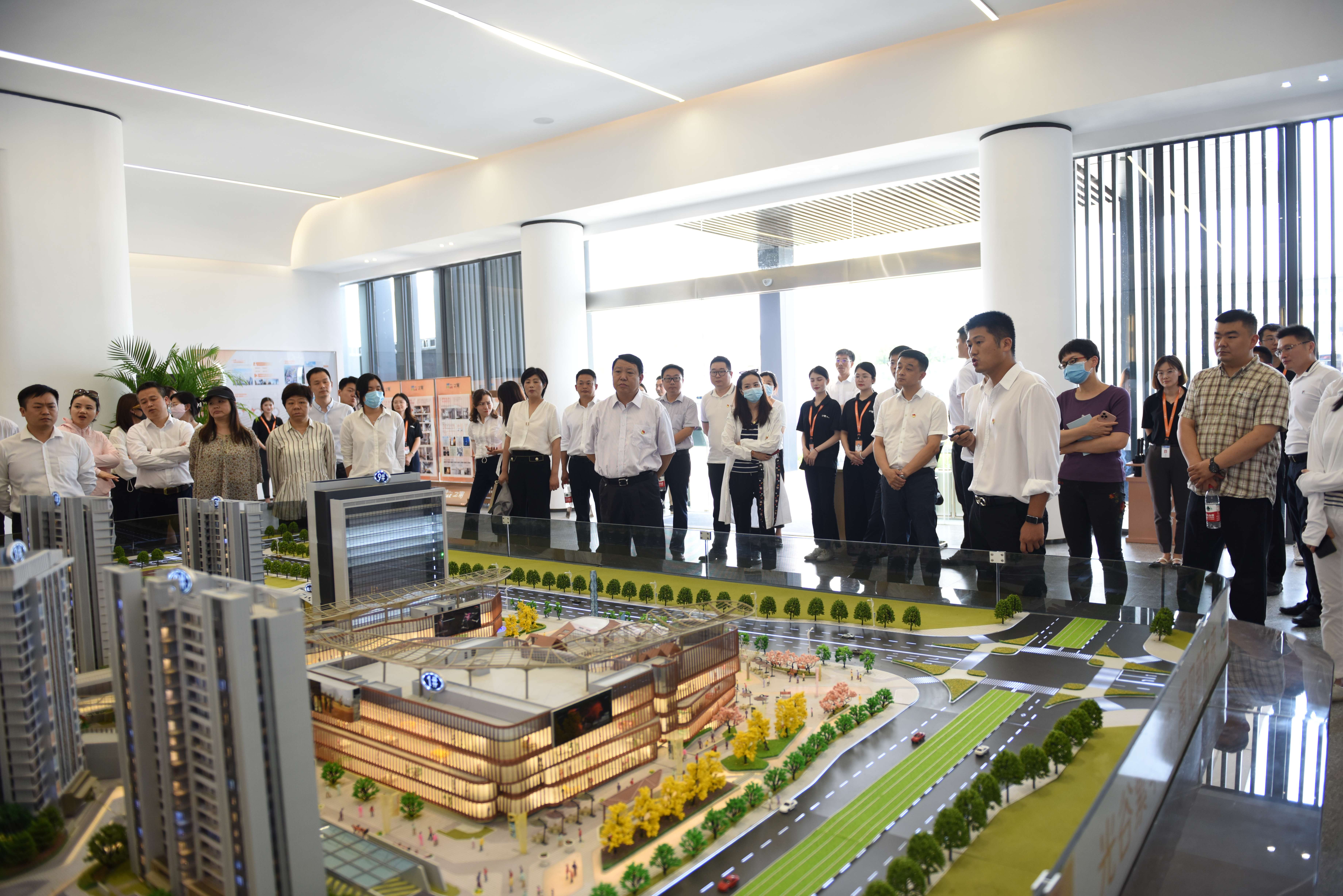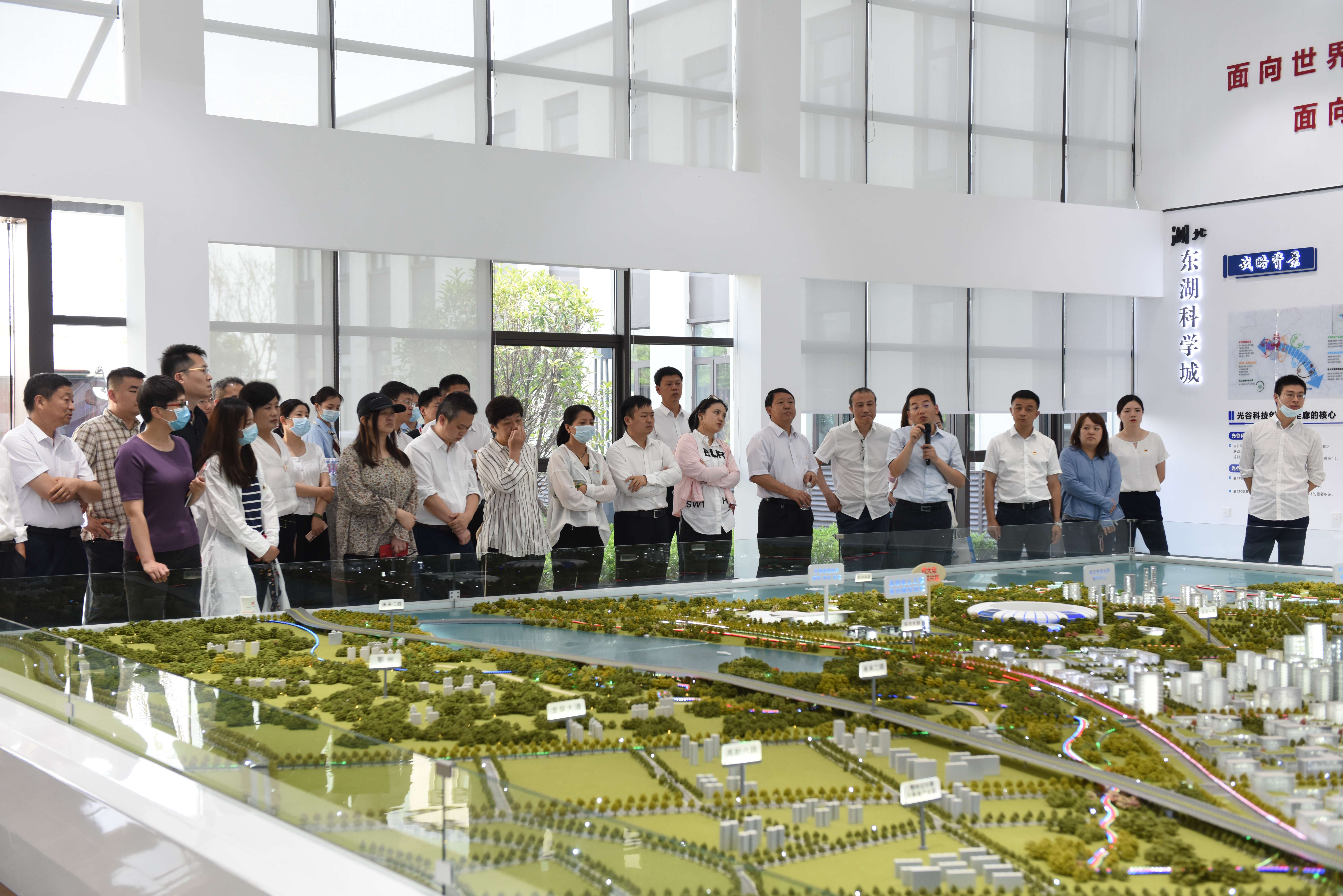 參觀現(xiàn)場(chǎng),產(chǎn)業(yè)園公司總經(jīng)理王樂介紹了創(chuàng)新園二期及海洋院項(xiàng)目基本情況與施工進(jìn)度,創(chuàng)新園二期項(xiàng)目商業(yè)配套、多層研發(fā)、展示中心及獨(dú)棟多層廠房已封頂;海洋院項(xiàng)目已進(jìn)入裝修部分收尾階段,預(yù)計(jì)8月項(xiàng)目全部完工交付使用。光谷置業(yè)公司總經(jīng)理祁佺向大家介紹了之寓未來項(xiàng)目的開工進(jìn)展情況,并展示了之寓未來項(xiàng)目樣板間,該項(xiàng)目建設(shè)除去疫情僅13個(gè)月達(dá)到精裝入住標(biāo)準(zhǔn),一期首開2-8棟947套1577間,于7月15日入住,剩余8棟2194套將于明年三月交付入住,二期今年7月底開工,2024年整體交付;數(shù)字經(jīng)濟(jì)產(chǎn)業(yè)園項(xiàng)目地下室施工已完成,正在進(jìn)行地上主體結(jié)構(gòu)施工,預(yù)計(jì)2025年12月竣工。隨后汪志忠一行帶領(lǐng)大家前往科學(xué)島展廳及項(xiàng)目指揮部,科投集團(tuán)副總經(jīng)理劉坤對(duì)科學(xué)島項(xiàng)目整體規(guī)劃及建設(shè)進(jìn)度做了詳細(xì)介紹,科學(xué)島公司董事長(zhǎng)金波對(duì)科學(xué)島前期工作和展廳的建設(shè)做了全面介紹,按照管委會(huì)對(duì)科學(xué)島項(xiàng)目“4.30”任務(wù)節(jié)點(diǎn)相關(guān)工作要求,積極響應(yīng),在保障安全的前提下高效的完成了各項(xiàng)任務(wù)。
